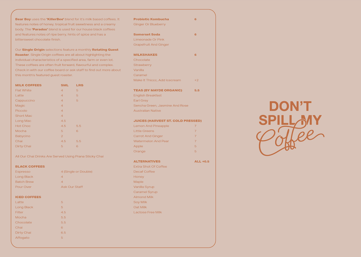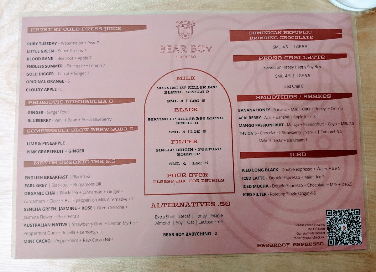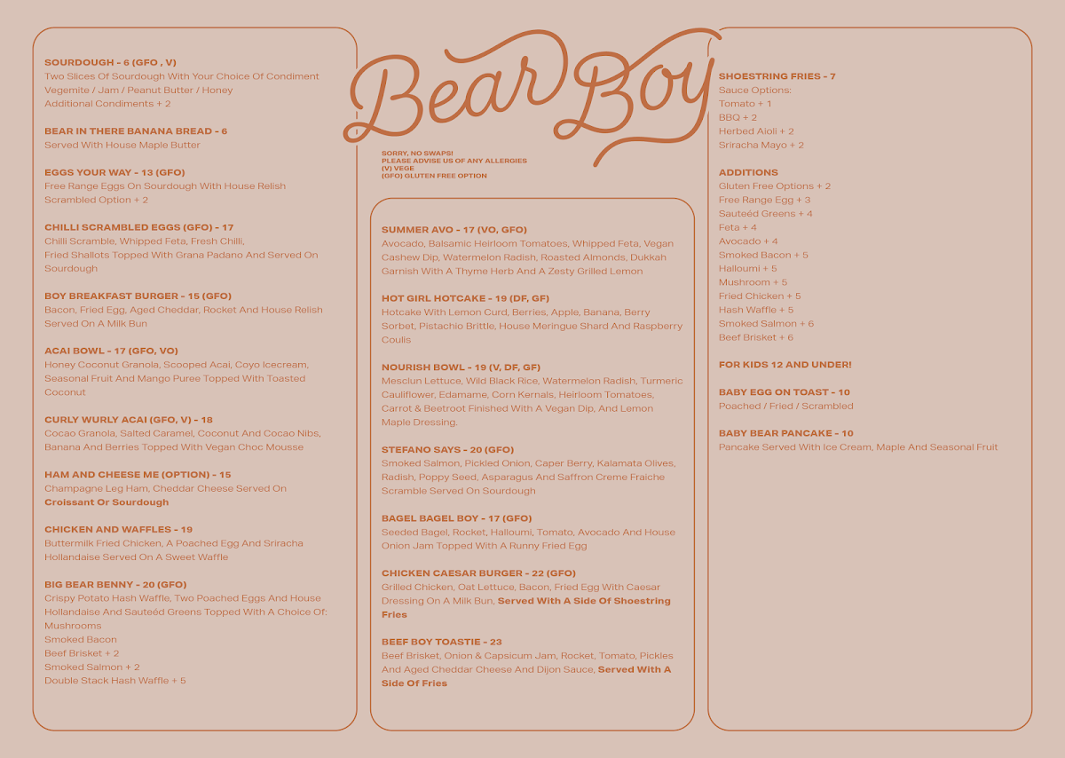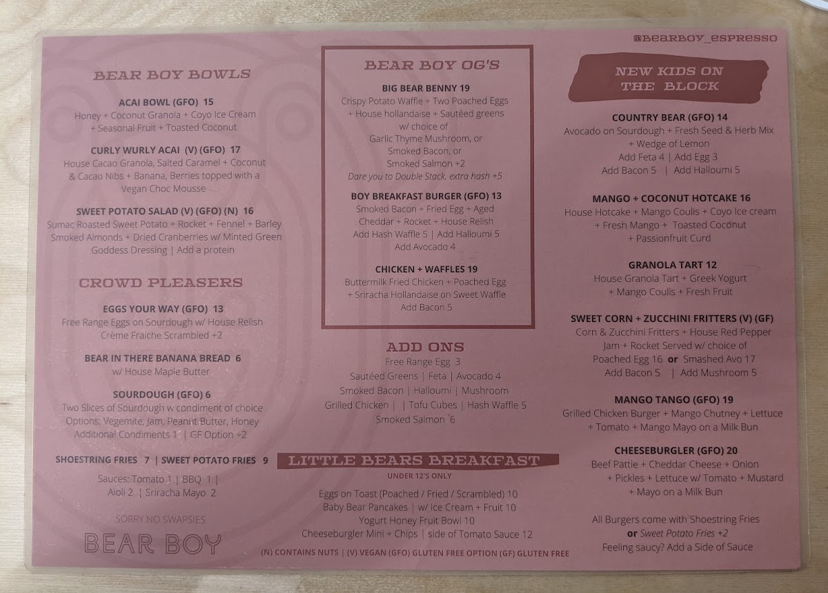 From the perspective of a satisfied reviewer, the menu at Bear Boy Espresso, located at Shop 8/180 Albion Rd, Windsor QLD 4030, Australia, feels thoughtfully curated to suit both everyday comfort seekers and adventurous brunch lovers, making it a strong final impression of the café’s identity. The coffee offering alone sets a confident foundation, with classic milk-based choices such as Flat White, Latte, Cappuccino, Magic, and Piccolo, alongside bold black options like Espresso, Long Black, Batch Brew, and Pour Over, showing a clear respect for quality and variety. Beyond coffee, the fresh juice selection-including Apple, Orange, Lemon And Pineapple, Little Greens, and Carrot And Ginger-adds a refreshing, health-conscious balance, further complemented by bottled options like Ruby Tuesday, Little Green, Blood Bank, Endless Summer, and Gold Digger from Hrvst St Cold Press Juice, as well as probiotic kombucha flavors Ginger and Blueberry. Food-wise, the menu confidently caters to all ages and appetites: nourishing Bear Boy Bowls such as Acai Bowl, Curly Wurly Acai, and Sweet Potato Salad sit comfortably beside reliable favorites like Eggs Your Way, Bear In There Banana Bread, Sourdough, Shoestring Fries, and Sweet Potato Fries. Signature plates under Bear Boy Og's, including Big Bear Benny, Boy Breakfast Burger, and Chicken + Waffles, stand out as indulgent highlights, while the kids are clearly not forgotten with options like Baby Egg On Toast, Baby Bear Pancake, Eggs On Toast, Baby Bear Pancakes, Yogurt Honey Fruit Bowl, and Cheeseburgler Mini + Chips. The creativity continues with Country Bear, Mango + Coconut Hotcake, Granola Tart, Sweet Corn + Zucchini Fritters, and Mango Tango, rounding out a menu that feels both playful and well-balanced. Even the small details-such as teas like English Breakfast, Earl Grey, Australian Native, and add-ons like Vanilla Syrup and Almond Milk-reinforce the sense that this menu has been designed with care. Overall, the menu at Bear Boy Espresso successfully ties together quality coffee, vibrant flavors, and inclusive choices, leaving a cohesive and memorable conclusion to the dining experience.